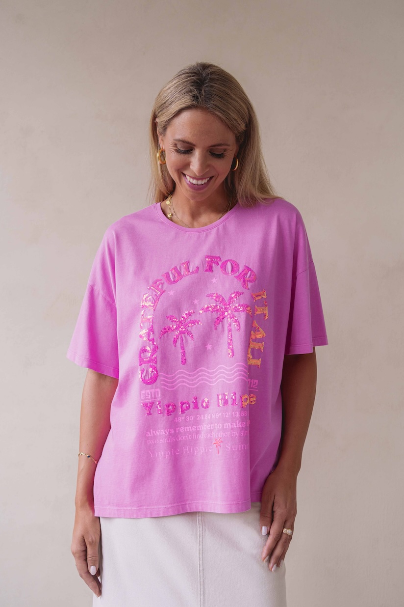 Pinkfarbenes T-Shirt mit aufwendigem und glitzerndem Paillettenstitching und Motivprint